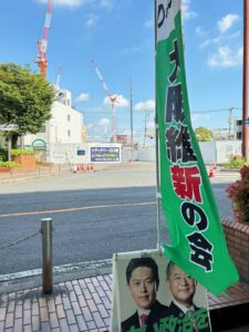 毎月22日は統一行動デーです。大阪維新の会所属の議員は党勢拡大のため、各々がさまざまな活動を行っております。私は朝に古川橋駅でのご挨拶からスタートです。現在駅の北側ではタワーマンションが建設されており、今後市によって、図書館や交流広場が整備され、令和8年度にまちびらきを迎える予定です。